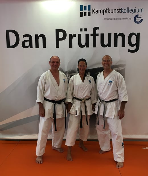 Christine Moosherr und Thomas Faust stellten sich am 21. Juli 2018 der Dan-Prüfung (Meister-Prüfung) in Friedrichshafen am Bodensee. Christine Mossherr erhielt den 4. und Thomas Faust den 5. Dan. Bild mit Prüfer und ehemaligen Bundestrainer Dr. Toni Dietl