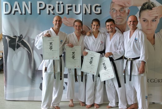 Am ersten August-Wochenende stellten sich die vier Trainer des Karate Teams der Dan-Prüfung in Friedrichshafen am Bodensee. Den 1. Dan erhielten Hannah Faust und Heiko Höhn, den 2. Dan Daniel Bast und den 4. Dan Thomas Faust. Rechts im Bild, Toni Dietl, 7. Dan, Prüfer und langjähriger Bundestrainer.